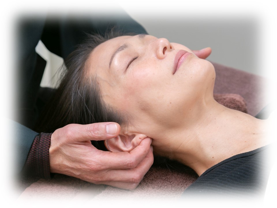 手技により、5~10g(ハガキ 2~3枚の重さ)のやさしい圧力で、頭の筋膜を調整し、頭蓋骨と体の歪みを解除します。