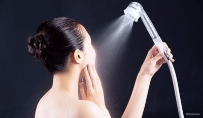トルネードスティックに搭載された亜硫酸カルシウムフィルターにより、水道水中の残留塩素を除去。肌への塩素刺激を抑えたやさしいシャワーへと進化しました。