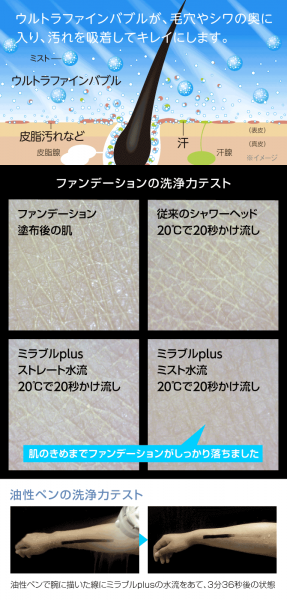 ミラブルplusの特長は、なんといっても洗浄力。ファンデーションを使った洗浄実験でも、毛穴の細かいところまでウルトラファインバブルが入り込み、汚れを吸着してキレイに落としていることがわかります。