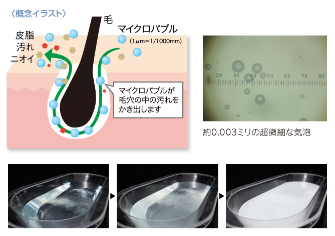 水と空気でできた超微細な気泡が、肌のすみずみまでの汚れや毛穴の奥の老廃物などを吸着して取り除くほか、気になる臭いの元もかき出して洗い流します。