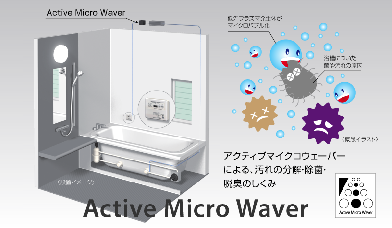 ただお湯に身を委ねているだけで、ミクロの泡がお肌の老廃物を取り除き、健康的でつややかな美肌にしてくれる「マイクロバブルトルネード」に「アクティブマイクロウェーバー(AMW)」をシステムとして搭載し、浴室内の衛生までも追究した製品です。ボタン一つで汚れの分解・殺菌・脱臭を自動で行うことができ、衛生的な入浴環境の維持が容易です。